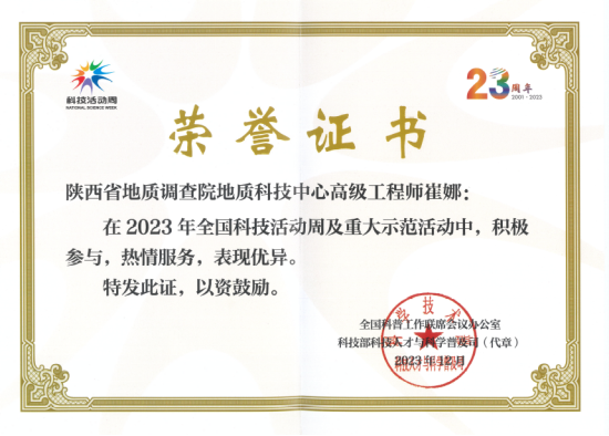 近日,根据科技部、中央宣传部、中国科协《关于举办2023年全国科技活动周的通知》(国科函才〔2023〕65号)、全国科普工作联席会议办公室《关于推荐2023年全国科技活动周表现突出参与单位和人员的通知》(科普联办〔2023〕5号),经全国科普工作联席会议办公室审批,2023年全国科技活动周先进集体和先进个人获奖名单公布。9323彩集团地质科技中心地球系统科学普及推广工作站站长、高级工程师崔娜同志荣获“全国科技活动周先进个人”表彰。