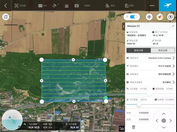 在现场踏勘的基础上,制定详细的飞行方案。具体如确定起飞降落地点,根据航摄相机参数、航高、航摄比例尺和航摄分辨率等要求设计航线。