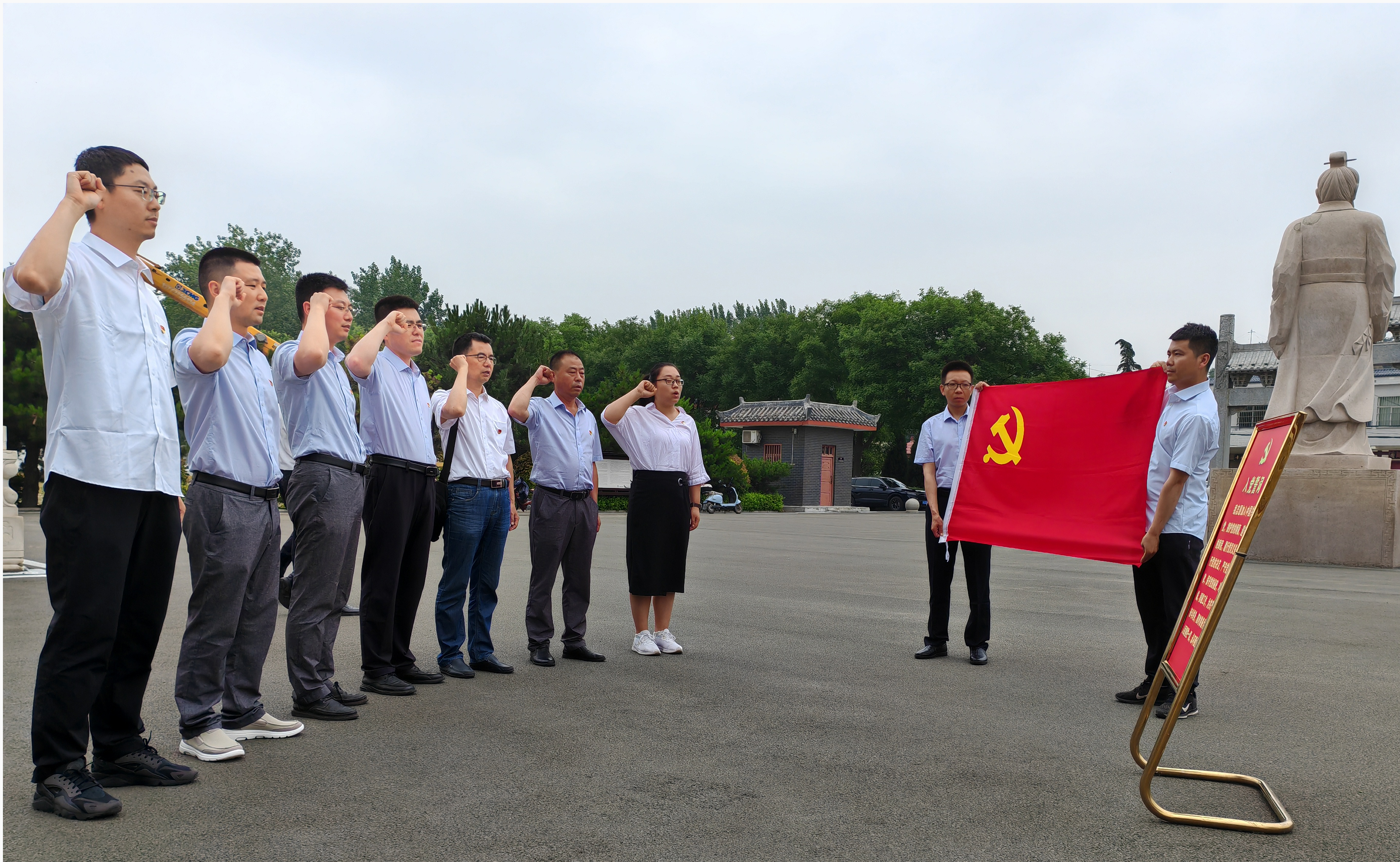 在廉政博物馆前,面对鲜红的党旗,全体党员重温入党誓词,回忆入党初心,表达了为党的事业奋斗终生的坚定信念与决心。
