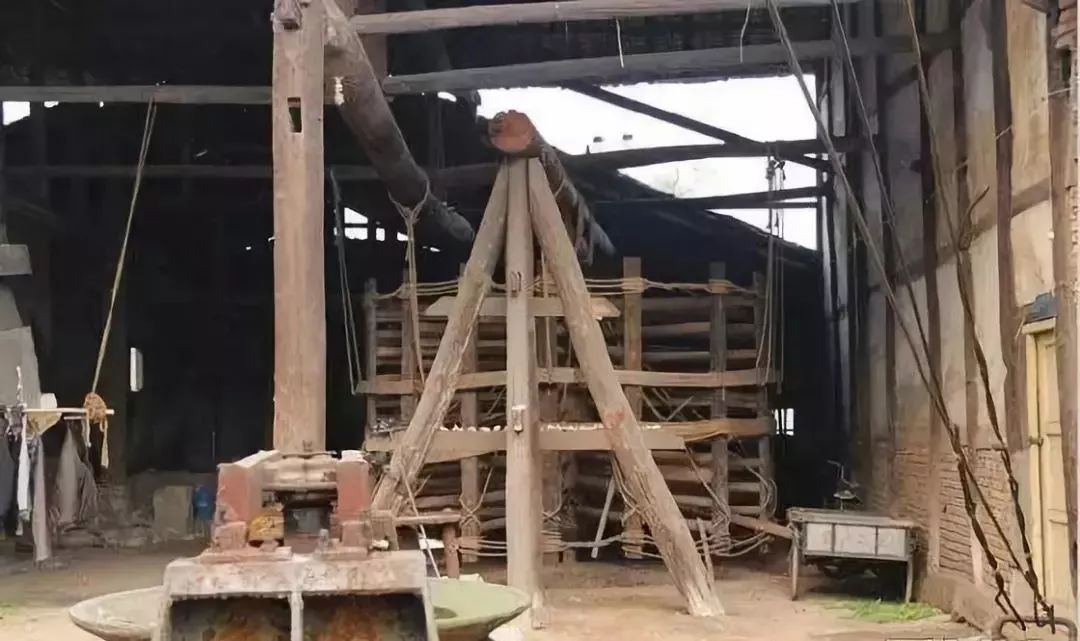凿井的工具,使用的是铁锥,铁锥的形状很像碓嘴,要把铁锥的尖端做得非常坚固锋利,才能用它在石上冲凿成孔。铁锥的锥身是用破开两半的竹片夹住,再用绳缠紧做成的。每凿进数尺深,就要用竹竿子把它接上以增加它的身长。起初的这一丈多深,可以用脚踏碓梢,就像舂米那样。再深一些就用两手将铁锥举高然后再用力夯下去,这可能把石头捣得粉碎,随后把长竹接在一起再捆上铁勺,把碎石挖出来。打一眼深井大约需要半年左右的时间,而打一眼浅井一个多月就能够成功了。如果井眼凿的过大,卤气就会游散,以致不能凝结成盐。当盐井凿到卤水层能打出水后,挑选一根长约一丈的好竹子,将竹内的节都凿穿,只保留最底下的一节,并在竹节的下端安一个汲水的单向阀门以便汲取盐水入筒。用长绳拴上这根竹筒,将它沉到井底之下,竹筒内就会汲满了盐水。井上安装汲水器具或辘轳等提水工具,操作方法是套上牛,用牛拉动转盘而带动辘轳绞绳把盐水汲上来。然后将卤水倒进锅里煎炼(只用中等大小的锅,而不用牢盆),很快就能凝结成雪白的盐了。