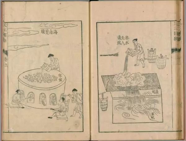《天工开物》初刊于1637年(明崇祯十年),宋应星编著,是世界上第一部关于农业和手工业生产的综合性著作,也是中国古代一部综合性的科学技术著作,外国学者称它为“中国17世纪的工艺百科全书”。作者在书中强调人类要和自然相协调、人力要与自然力相配合,反映了中国明代末年出现资本主义萌芽时期的生产力状况。其中《作咸》一篇,则是一部中国古代对盐分布、开采、制盐工艺记载最详尽的科学教科书。