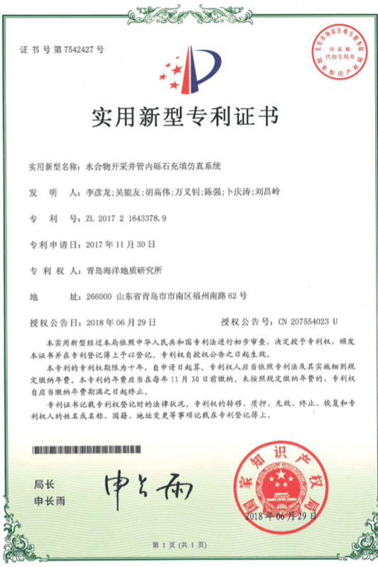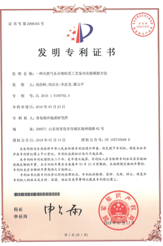 其中,“一种天然气水合物钻采工艺室内实验模拟方法(ZL 2016 1 0169792.4)”公开了一种基于大尺寸全三维天然气水合物开采仿真系统的水合物开采过程监测、模拟新方法,该仿真系统是目前国内容积最大的天然气水合物仿真模拟装备,是目前国际上唯一一套可以模拟水合物储层钻采全过程及储层响应特征的模拟装备,目前该装置已经投入使用,为完成调查研究项目任务发挥了重要作用。
