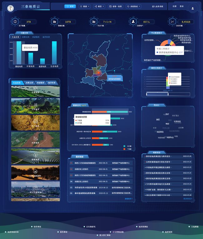 此次上线的“三秦地质云3.0”平台,是在中国地质调查局发布的“地质云·陕西”2.0版本基础上,进一步丰富和完善了数据源和功能应用。平台汇聚了地质、地震、气象、测绘、人文、经济社会等10大门类专题数据,上线了行业应用、决策支持、科研服务和地学科普4大类,共计30余个专题地学信息产品。其中行业应用包含基础地质、环境地质、生态地质、矿产地质、灾害地质、能源地质、城市地质、自然资源调查、国土空间规划等9个专题;决策支持包含自然资源、生态环境、应急救灾、能源矿产、乡村振兴、国土空间、上合遥感、智慧城市等8个专题;科研服务包含专利、软著、政策法规等10个专题;地学科普包含科普活动、科普图书、科普融媒体等5个专题。