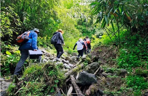 在“盆地”稍做休息后,开始爬山梁,这也是通往圈子崖天坑最陡峭的一段。原始森林与竹林阻挡了前进方向,只有凭借科考队员的记忆前行,领队李益朝(陕西省矿产地质调查中心地质遗迹调查所所长,高级工程师,水文地质、地质遗迹专家)走在最前方,边走边用竹竿敲打着树枝寻路,同时也在驱赶树叶上的蚂蟥。