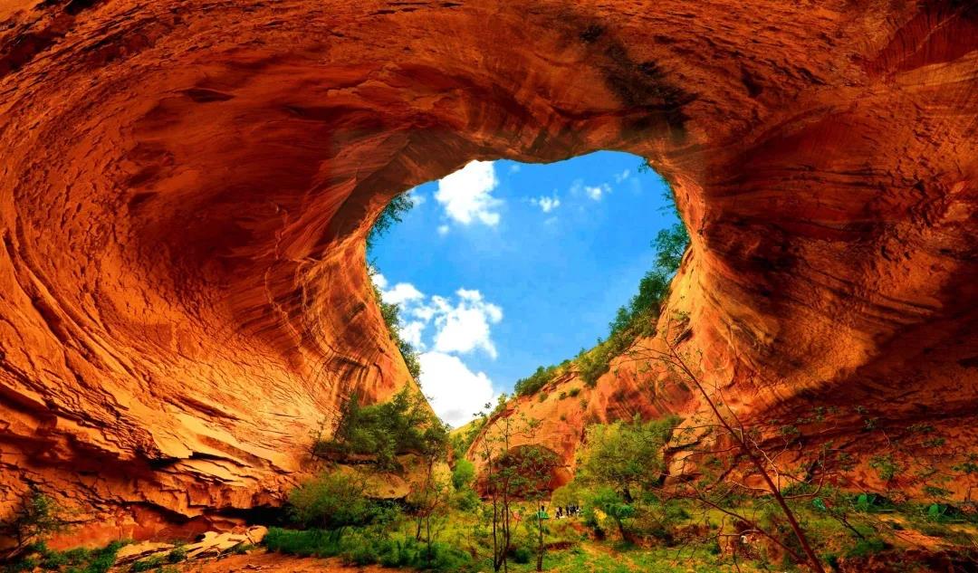 红色砂砾岩层形成的陡崖坡地貌,被称为丹霞地貌,是中国大地上最明亮的一抹赤红。陕北地区的丹霞地貌,不仅有常见的“沟谷”型和孤峰型丹霞地貌,还有罕见的丹霞石蘑菇、天生桥、心型霞等景观,其雄浑壮美令人流连忘返、赞叹不绝。